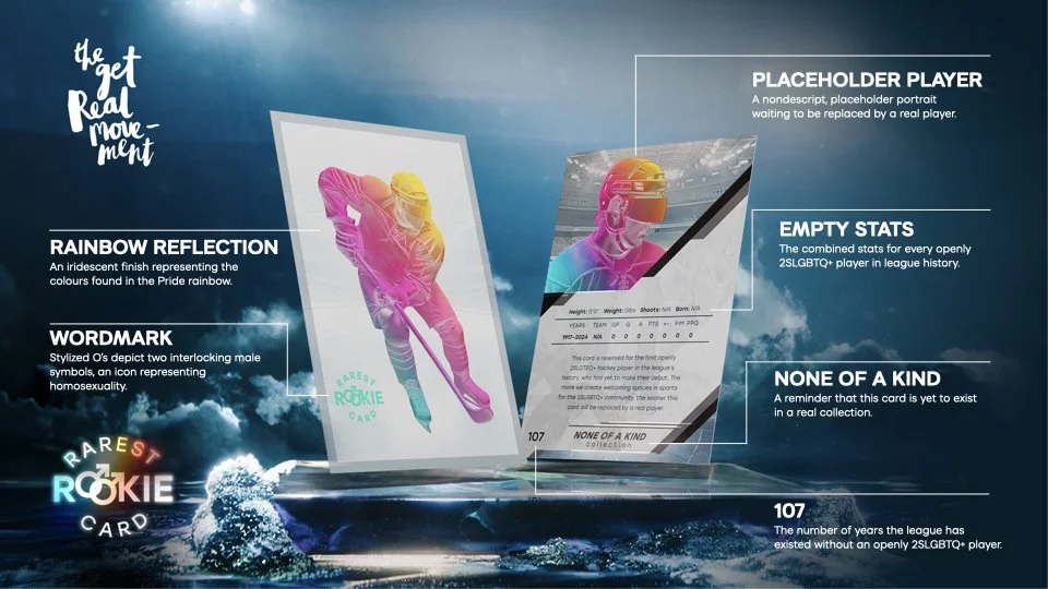 On National Hockey Card Day, we will be releasing the ”Rarest Rookie Card”: an incomplete hockey card for an unidentifiable player which we hope it will not only raise awareness of the lack of 2SLGBTQ+ representation in the league, but will also foster a culture of support and inclusivity, acting as a catalyst for the first openly 2SLGBTQ+ identified player to make their debut.